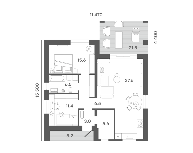Кухня-гостиная 37,6 м² с выходом на террасу.