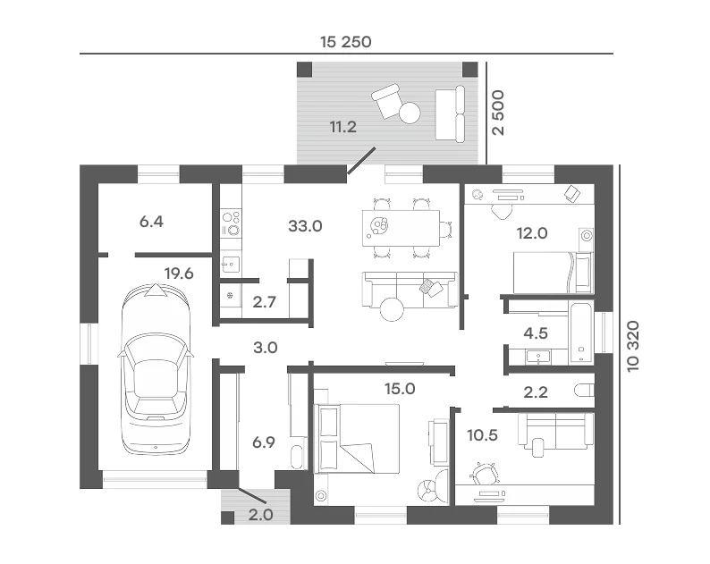 Кухня-гостиная 33 м² с выходом на террасу.